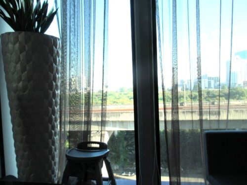 カーテンの隙間から、都会らしいビルなどの建物が見えました。